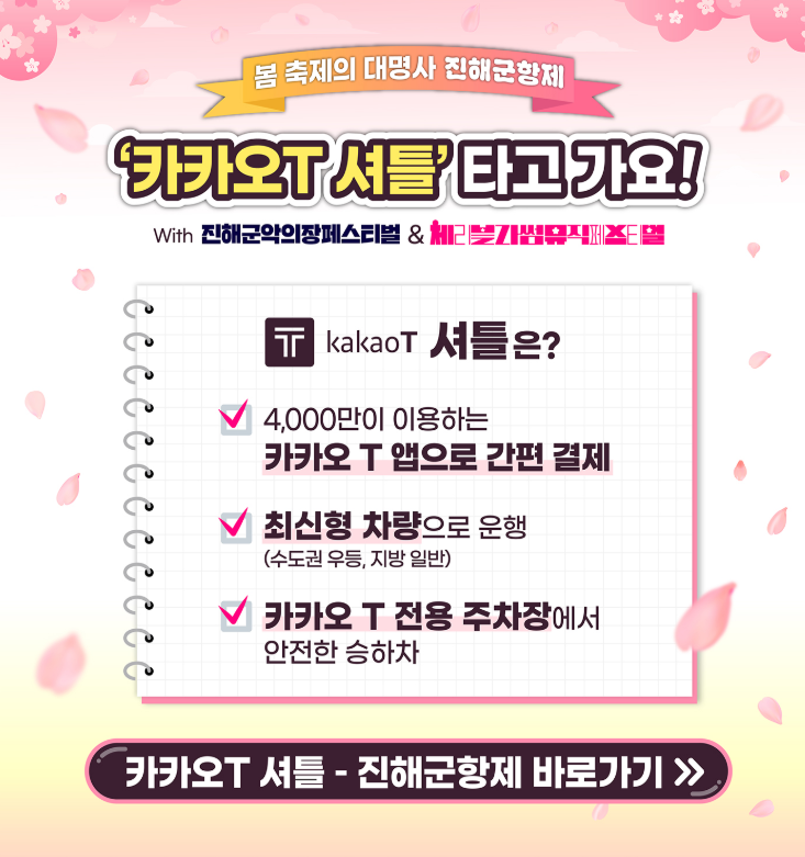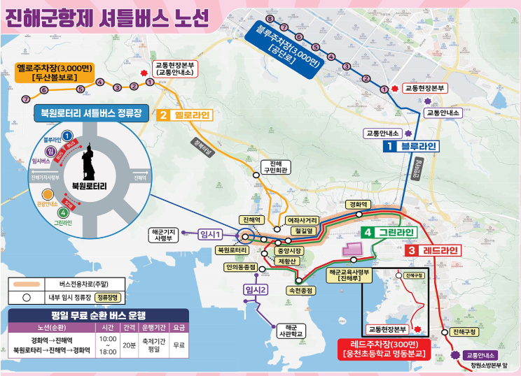 - 대중교통: KTX 창원중앙역 or 진해역 하차 후 셔틀버스 이용