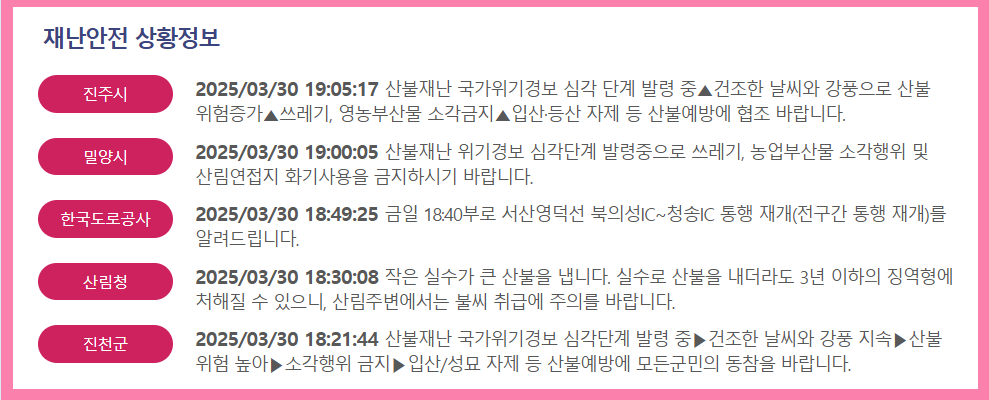 최근 발생한 2025년 3월 경북 의성, 경남 하동, 울산 울주 지역 산불로 인해 수많은 이재민이 발생했습니다. 험준한 지형과 어려운 환경 속에서도 불길을 막기 위해 애써주신 소방공무원, 군인, 진화대원분들의 노고에 깊은 감사를 드립니다.